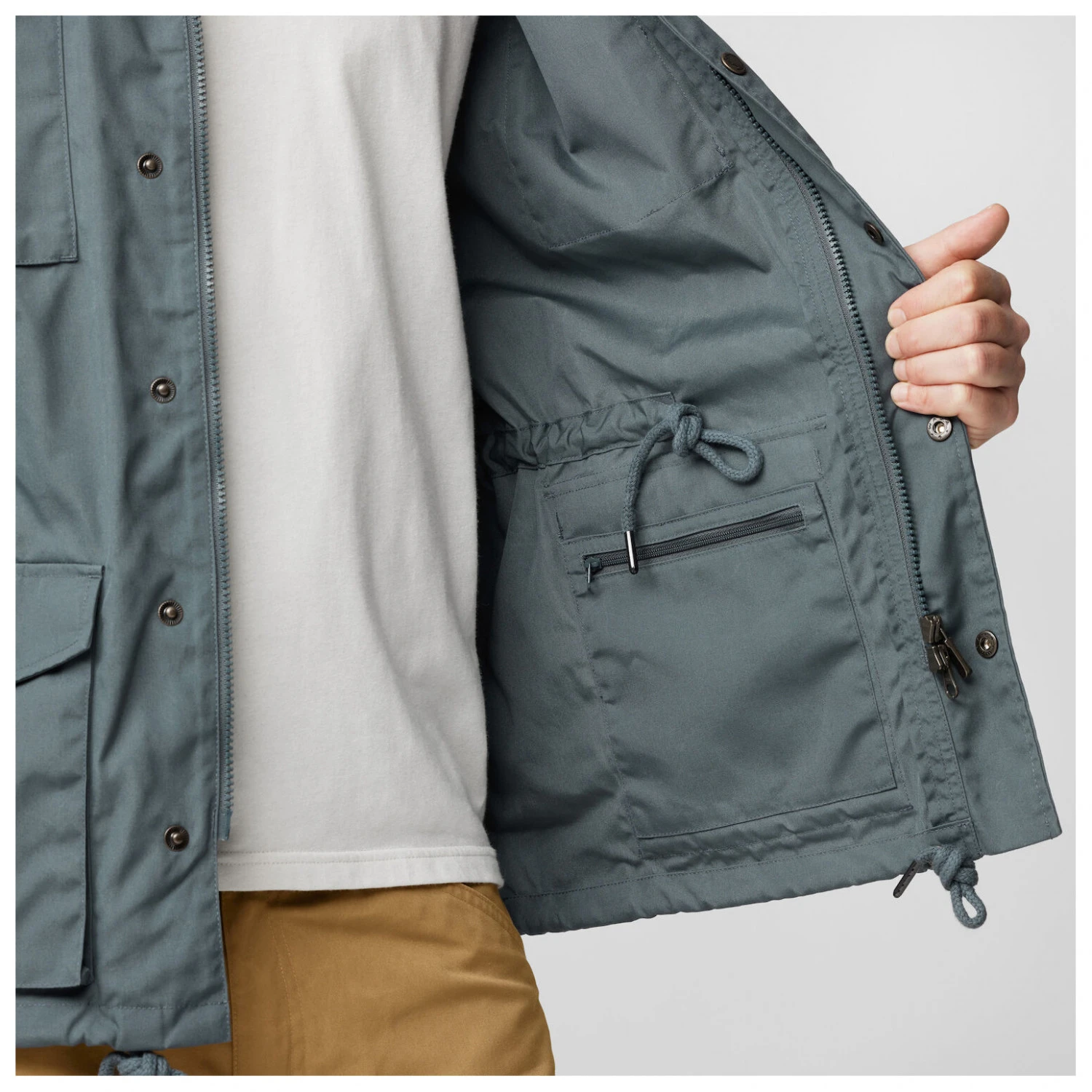 A total of four outer pockets and a zipped pocket on the inside ensure that every box is checked. The hood can be packed away in the collar as required. Thanks to the adjustable drawstring in the hem, the Fjällräven Räven Jacket protects you against the penetration of cold wind.